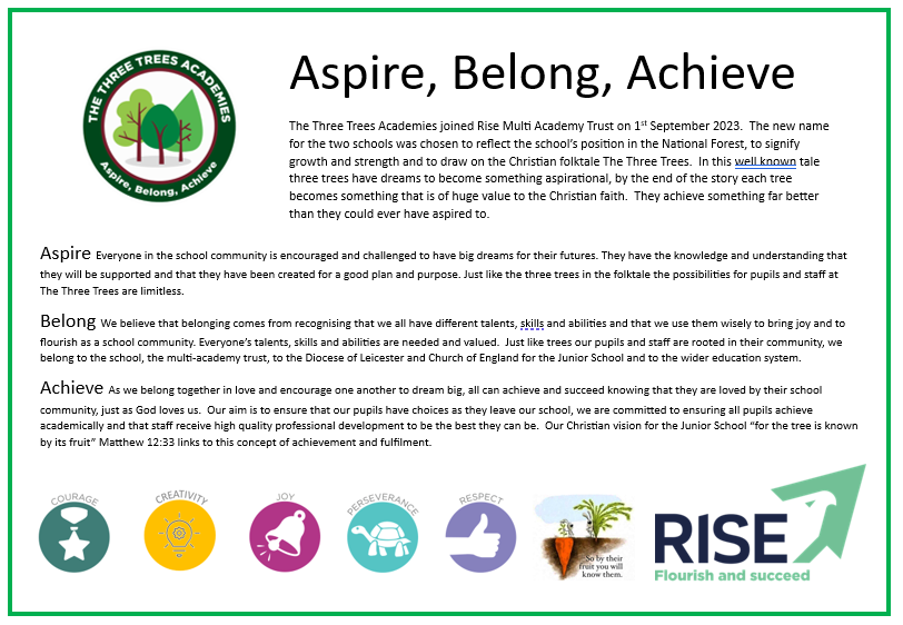 When Three Trees Academies opened on 1st September 2023, staff and pupils felt strongly that the school's core values of Courage, Creativity, Joy, Perseverance and Respect were even more relevant as the school moved forward with Rise.
